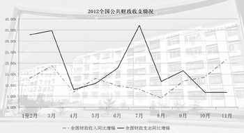 根據(jù)財政部公布的數(shù)據(jù),從2012年的整體財政收入情況來看,1至11月累計全國財政收入108903億元,比去年同期增加11594億元,增長11.9%?傮w看,今年財政收入增幅比去年同期明顯回落,1月至11月全國財政收入累計增幅比去年同期回落14.9個百分點。