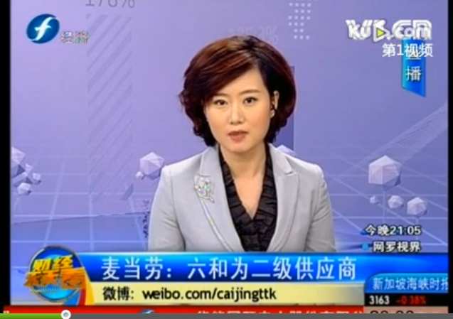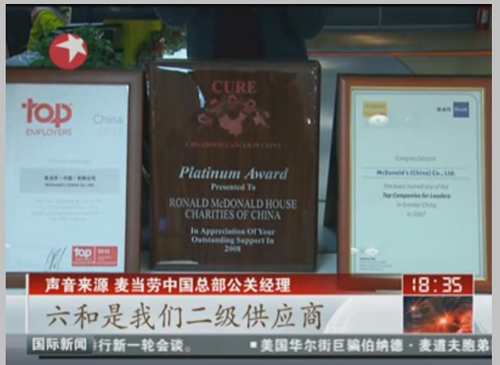 記者經(jīng)過仔細(xì)查找,發(fā)現(xiàn)了近日東方衛(wèi)視和福建東南衛(wèi)視的新聞視頻。視頻內(nèi)接受電視臺記者采訪的麥當(dāng)勞中國總部公關(guān)經(jīng)理給出了答案:六和是我們(麥當(dāng)勞)的二級供應(yīng)商。