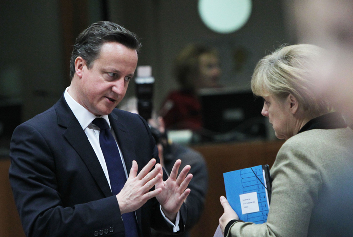 2012年12月14日,在比利時(shí)首都布魯塞爾舉行的歐盟峰會(huì)第二天會(huì)議上,英國首相卡梅倫(左)與德國總理默克爾交談。新華社記者
