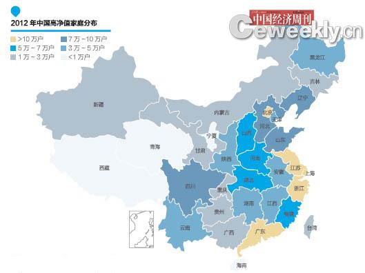 《2012年中國財富報告》稱北京、上海、江蘇、廣州、浙江為中國富人密度最高省市,這5省市富人總量占全國40%以上。