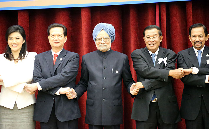 印度總理辛格在東盟-印度(10+1)領(lǐng)導人會議上與東盟領(lǐng)導人合影。記者 李鵬 攝 |