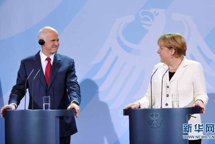 2011年9月27日,德國總理默克爾(右)和希臘總理帕潘德里歐在柏林出席新聞發(fā)布會。當(dāng)日,默克爾在柏林總理府會見到訪的帕潘德里歐,雙方將就如何進一步援助希臘展開討論。