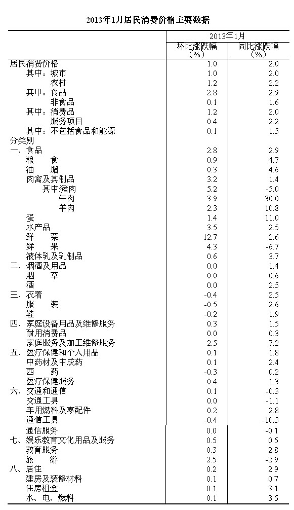 2013年1月份,全國居民消費價格總水平同比上漲2.0%。其中,城市上漲2.0%,農(nóng)村上漲2.2%;食品價格上漲2.9%,非食品價格上漲1.6%;消費品價格上漲2.0%,服務價格上漲2.2%。