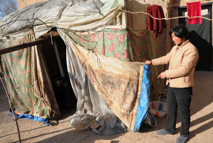 由于擔(dān)心危窯坍塌,常小萍和丈夫在院子里用塑料、破布搭了一大一小兩頂簡易帳篷,在慶陽市政府除夕發(fā)放救災(zāi)帳篷之前,常小萍夫婦已經(jīng)在里面住了一個(gè)多月。