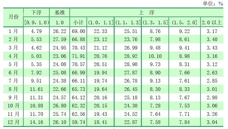 從利率浮動(dòng)情況看,執(zhí)行下浮利率的貸款占比有所上升。12