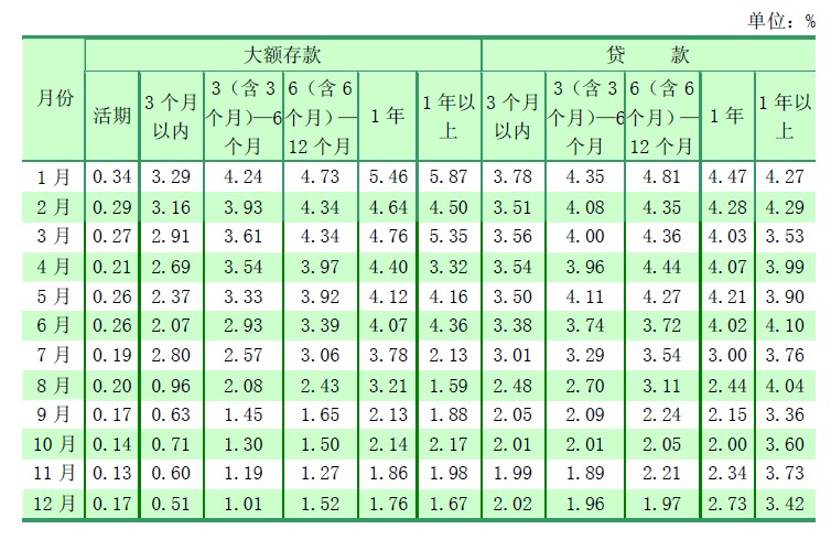 月份,中國(guó)人民銀行連續(xù)兩次下調(diào)存貸款基準(zhǔn)利率,并小幅擴(kuò)大利率浮動(dòng)區(qū)間,金融機(jī)構(gòu)貸款利率進(jìn)一步下降,并于年末趨于穩(wěn)定。12