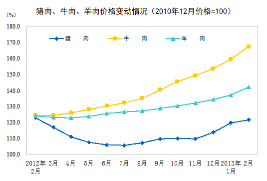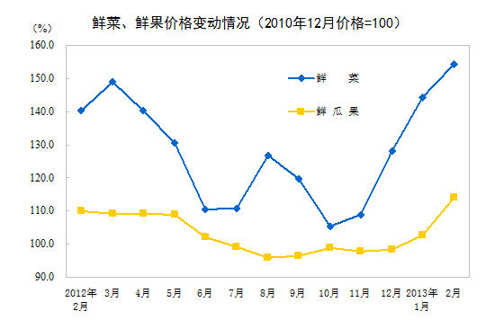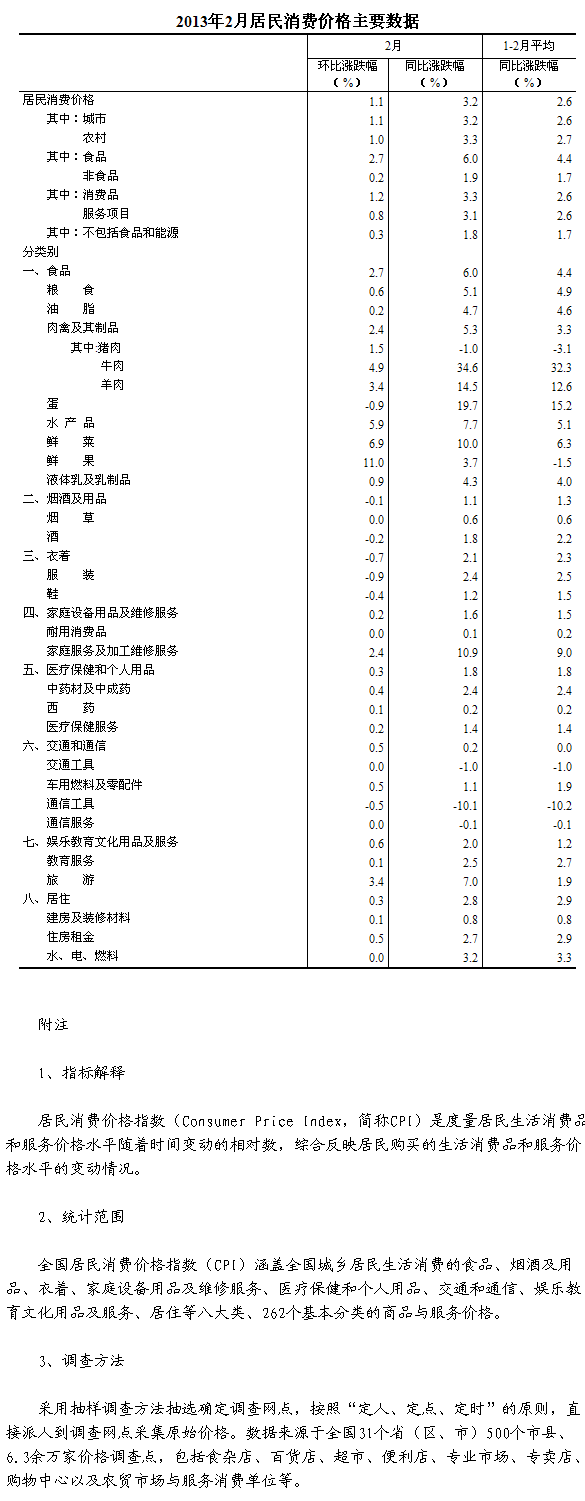 2013年2月份,全國居民消費價格總水平同比上漲3.2%。其中,城市上漲3.2%,農(nóng)村上漲3.3%;食品價格上漲6.0%,非食品價格上漲1.9%;消費品價格上漲3.3%,服務價格上漲3.1%。