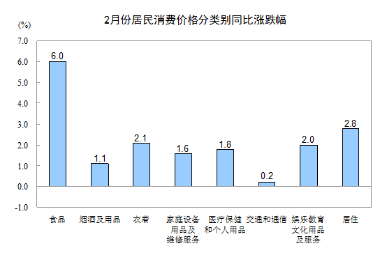 2月份,食品價格同比上漲6.0%,影響居民消費價格總水平同比上漲約1.98個百分點。其中,肉禽及其制品價格上漲5.3%,影響居民消費價格總水平上漲約0.40個百分點(豬肉價格下降1.0%,影響居民消費價格總水平下降約0.04個百分點);鮮菜價格上漲10.0%,影響居民消費價格總水平上漲約0.34個百分點;水產(chǎn)品價格上漲7.7%,影響居民消費價格總水平上漲約0.20個百分點;糧食價格上漲5.1%,影響居民消費價格總水平上漲約0.15個百分點;鮮果價格上漲3.7%,影響居民消費價格總水平上漲約0.08個百分點;油脂價格上漲4.7%,影響居民消費價格總水平上漲約0.06個百分點。
