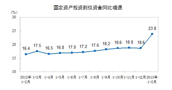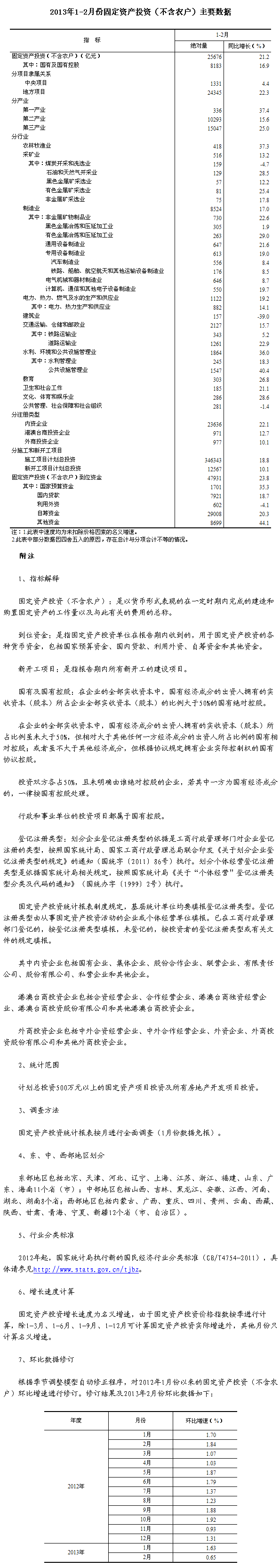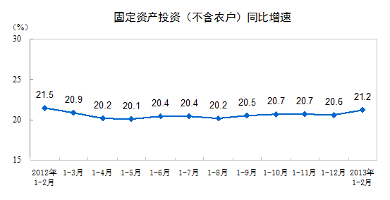 2013年1-2月份,全國(guó)固定資產(chǎn)投資(不含農(nóng)戶)25676億元,同比名義增長(zhǎng)21.2%,增速比去年全年加快0.6個(gè)百分點(diǎn),比去年同期回落0.3個(gè)百分點(diǎn)。從環(huán)比看,2月份固定資產(chǎn)投資(不含農(nóng)戶)增長(zhǎng)0.65%。