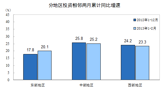 分地區(qū)看,1-2月份,東部地區(qū)投資13960億元,同比增長(zhǎng)20.1%,增速比去年全年加快2.3個(gè)百分點(diǎn);中部地區(qū)投資5785億元,增長(zhǎng)25.2%,增速回落0.6個(gè)百分點(diǎn);西部地區(qū)投資5668億元,增長(zhǎng)23.3%,增速回落0.9個(gè)百分點(diǎn)。