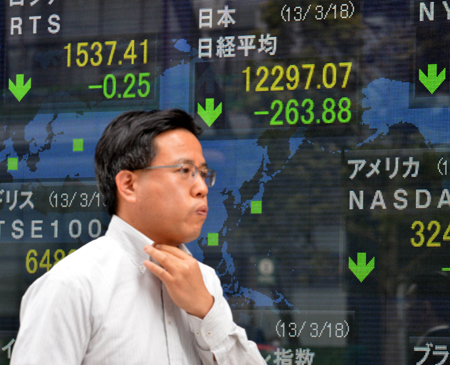 3月18日,行人走過(guò)日本東京街頭的一處電子股指顯示屏。