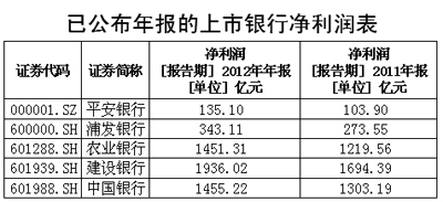 3月26日,農業(yè)銀行和中國銀行業(yè)績報告出爐,年報顯示,農行、中行2012年分別實現(xiàn)凈利潤1450.94億元、1394.32億元,同比增長幅度分別為19%、12.20%。此前,建設銀行24日晚間發(fā)布2012年年報,公司去年實現(xiàn)凈利潤1931.79億元,同比增長14.13%。