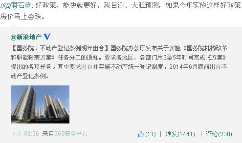 3月28日,國(guó)務(wù)院辦公廳就實(shí)施《國(guó)務(wù)院機(jī)構(gòu)改革和職能轉(zhuǎn)變方案》任務(wù)分工進(jìn)行通知,要求2014年6月底前出臺(tái)并實(shí)施不動(dòng)產(chǎn)統(tǒng)一登記制度,由國(guó)土資源部、住房城鄉(xiāng)建設(shè)部會(huì)同法制辦、稅務(wù)總局等有關(guān)部門負(fù)責(zé)。對(duì)此,SOHO中國(guó)董事長(zhǎng)潘石屹微博評(píng)論稱這是個(gè)好政策,并大膽預(yù)測(cè),如果今年實(shí)施房?jī)r(jià)馬上會(huì)跌。