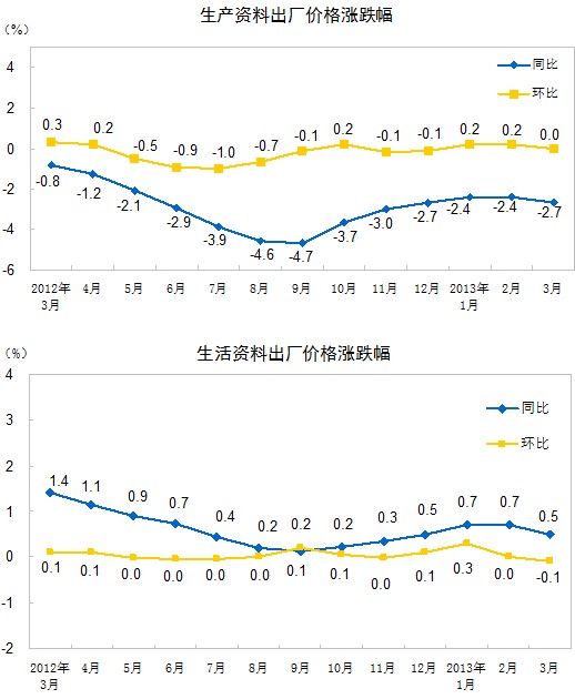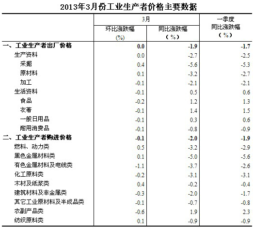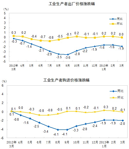 2013年3月份,全國(guó)工業(yè)生產(chǎn)者出廠價(jià)格同比下降1.9%,環(huán)比持平(漲跌幅度為0)。工業(yè)生產(chǎn)者購(gòu)進(jìn)價(jià)格同比下降2.0%,環(huán)比下降0.1%。一季度,工業(yè)生產(chǎn)者出廠價(jià)格同比下降1.7%,工業(yè)生產(chǎn)者購(gòu)進(jìn)價(jià)格同比下降1.9%。
