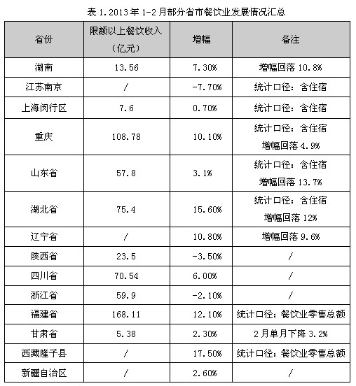 根據(jù)目前各省市統(tǒng)計部門已公布的數(shù)據(jù)(截至4月9日),2013年1-2月,各省市的餐飲業(yè)表現(xiàn)不一,呈現(xiàn)一、二線城市增長乏力,三、四線城市后勁不足的態(tài)勢。