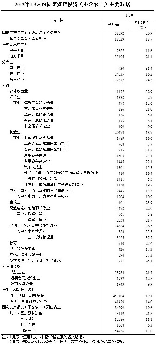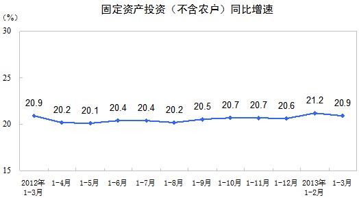 2013年1-3月份,全國固定資產(chǎn)投資(不含農(nóng)戶)58092億元,同比名義增長20.9%(扣除價格因素實際增長20.7%),增速比1-2月份回落0.3個百分點,與去年同期持平。從環(huán)比看,3月份固定資產(chǎn)投資(不含農(nóng)戶)增長1.59%。