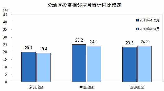 分地區(qū)看,1-3月份,東部地區(qū)投資30349億元,同比增長19.4%,增速比1-2月份回落0.7個百分點;中部地區(qū)投資14275億元,增長24.1%,增速回落1.1個百分點;西部地區(qū)投資13122億元,增長24.2%,增速加快0.9個百分點。
