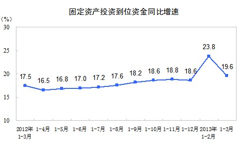 從到位資金情況看,1-3月份,到位資金84899億元,同比增長19.6%,增速比1-2月份回落4.2個百分點。其中,國家預算資金增長21.8%,增速回落13.5個百分點;國內(nèi)貸款增長11.1%,增速回落7.6個百分點;自籌資金增長17%,增速回落3.3個百分點;利用外資增長6.3%,增速比1-2月份加快10.4個百分點。