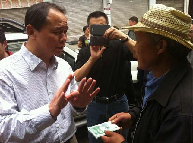 | 人保集團(tuán)董事長(zhǎng)吳焰親手將第一筆5000元賠款送到了客戶駱瑞森手中。劉周維/攝 |