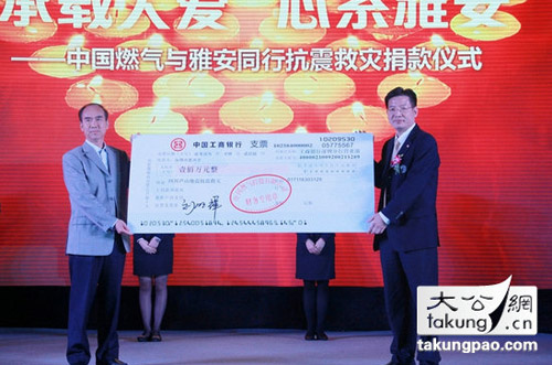 4月26日,中國燃?xì)庠谏钲谂e行2013財(cái)年工作會(huì)議,并在現(xiàn)場舉行了“承載大愛,心系雅安——中國燃?xì)馀c雅安同行”的抗震救災(zāi)捐款儀式。集團(tuán)執(zhí)行總裁黃勇代表中國燃?xì)庥H自將100萬元善款交到了深圳市政協(xié)副主席、深圳市慈善會(huì)副會(huì)長姚欣耀的手中。