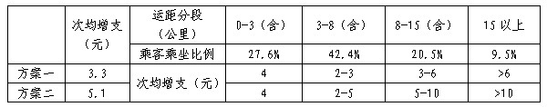 方案一:基價標(biāo)準(zhǔn)由10元/3公里調(diào)整為13元/3公里;計程標(biāo)準(zhǔn)由2元/公里調(diào)整為2.3元/公里。燃油附加費由3公里以上運次加收3元調(diào)整為全部運次加收1元。