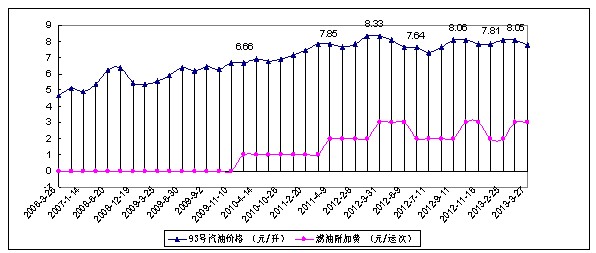 2011年2月20日,本市93號汽油價格達(dá)到7.45元/升,超過租價油價聯(lián)動機(jī)制啟動點7.10元/升?紤]價格宏觀調(diào)控情況,未進(jìn)行租價調(diào)整,繼續(xù)采取加收燃油附加費方式。2011年2月以來,本市根據(jù)油價變動,4次上調(diào)2次下調(diào)燃油附加費標(biāo)準(zhǔn)。