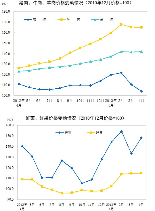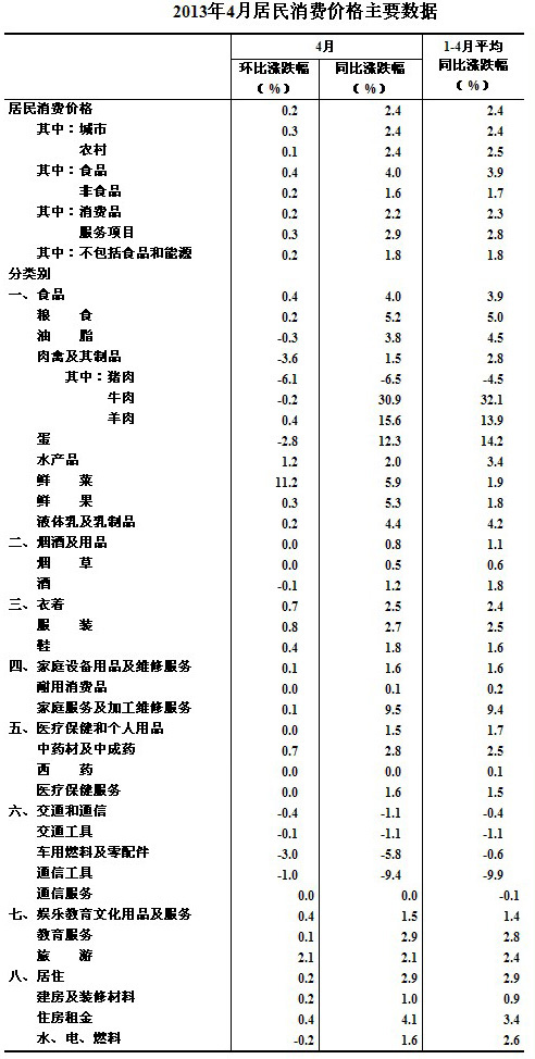 2013年4月份,全國居民消費價格總水平同比上漲2.4%。其中,城市上漲2.4%,農(nóng)村上漲2.4%;食品價格上漲4.0%,非食品價格上漲1.6%;消費品價格上漲2.2%,服務(wù)價格上漲2.9%。1-4月平均,全國居民消費價格總水平比去年同期上漲2.4%。