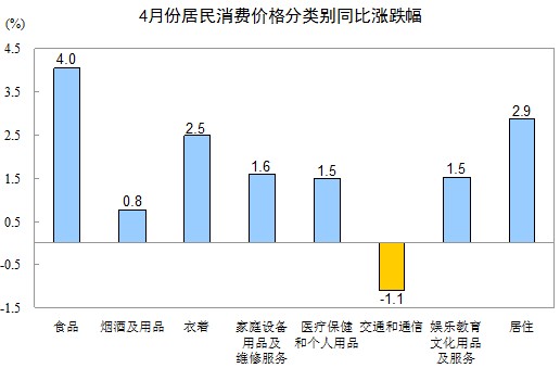 4月份,食品價格同比上漲4.0%,影響居民消費價格總水平同比上漲約1.33個百分點。其中,鮮菜價格上漲5.9%,影響居民消費價格總水平上漲約0.20個百分點;糧食價格上漲5.2%,影響居民消費價格總水平上漲約0.15個百分點;肉禽及其制品價格上漲1.5%,影響居民消費價格總水平上漲約0.11個百分點(豬肉價格下降6.5%,影響居民消費價格總水平下降約0.21個百分點);鮮果價格上漲5.3%,影響居民消費價格總水平上漲約0.11個百分點;油脂價格上漲3.8%,影響居民消費價格總水平上漲約0.05個百分點;水產(chǎn)品價格上漲2.0%,影響居民消費價格總水平上漲約0.05個百分點。