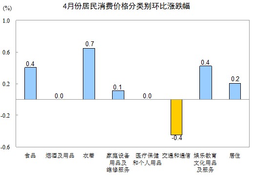 4月份,全國居民消費價格總水平環(huán)比上漲0.2%。其中,城市上漲0.3%,農(nóng)村上漲0.1%;食品價格上漲0.4%,非食品價格上漲0.2%;消費品價格上漲0.2%,服務(wù)價格上漲0.3%。