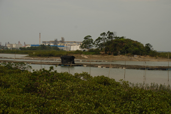 透過紅樹林向北眺望,一排白色油罐與幾個(gè)高聳的煙囪映入眼簾,這就是中石油廣西石化。記者