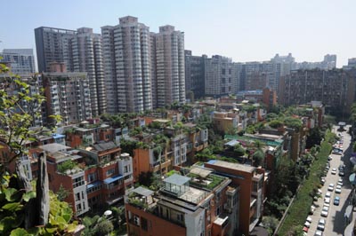 成都市南邊某小區(qū)樓頂戶戶都有屋頂花園。屋頂花園成為成都市居民樓一大亮點。