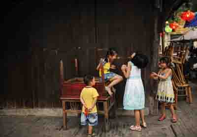 孩子們在安仁古鎮(zhèn)的街邊玩耍。