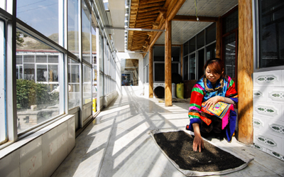 土族姑娘在自家陽(yáng)臺(tái)晾曬糧食