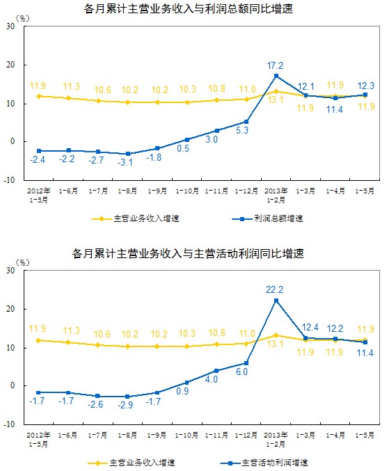 1-5月份全國規(guī)模以上工業(yè)企業(yè)實現(xiàn)利潤總額20812.5億元,比去年同期增長12.3%,其中,主營活動利潤23271.7億元,比去年同期增長11.4%。
