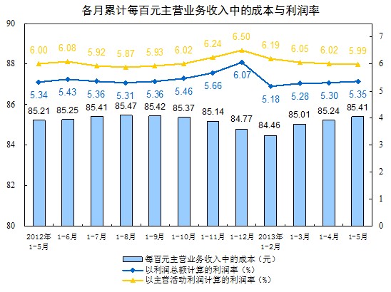 1-5月份,規(guī)模以上工業(yè)企業(yè)實現(xiàn)主營業(yè)務收入388731.8億元,比去年同期增長11.9%。每百元主營業(yè)務收入中的成本為85.41元,以利潤總額計算的利潤率為5.35%,以主營活動利潤計算的利潤率為5.99%。
