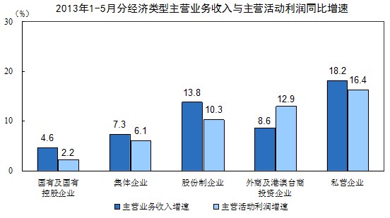 1-5月份,在規(guī)模以上工業(yè)企業(yè)中,國有及國有控股企業(yè)實現(xiàn)主營業(yè)務收入99911億元,比去年同期增長4.6%,每百元主營業(yè)務收入中的成本為82.56元,利潤率(以主營活動利潤計算的利潤率,下同)為5.25%;集體企業(yè)實現(xiàn)主營業(yè)務收入4752.7億元,增長7.3%,每百元主營業(yè)務收入中的成本為85.48元,利潤率為7.89%;股份制企業(yè)實現(xiàn)主營業(yè)務收入227769.2億元,增長13.8%,每百元主營業(yè)務收入中的成本為85.29元,利潤率為6.05%;外商及港澳臺商投資企業(yè)實現(xiàn)主營業(yè)務收入94039.7億元,增長8.6%,每百元主營業(yè)務收入中的成本為86.31元,利潤率為5.28%;私營企業(yè)實現(xiàn)主營業(yè)務收入124835.6億元,增長18.2%,每百元主營業(yè)務收入中的成本為86.46元,利潤率為7.09%。