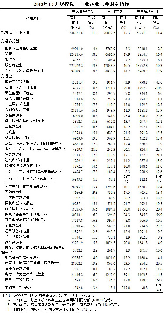 1-5月份,在規(guī)模以上工業(yè)企業(yè)中,國有及國有控股企業(yè)實現(xiàn)利潤總額5763.9億元,比去年同期增長3.3%,其中,主營活動利潤5248.1億元,比去年同期增長2.2%;集體企業(yè)實現(xiàn)利潤總額308.4億元,增長7.2%,其中,主營活動利潤375億元,增長6.1%;股份制企業(yè)實現(xiàn)利潤總額12048.8億元,增長10.5%,其中,主營活動利潤13772.8億元,增長10.3%;外商及港澳臺商投資企業(yè)實現(xiàn)利潤總額4933.8億元,增長14.7%,其中,主營活動利潤4968.2億元,增長12.9%;私營企業(yè)實現(xiàn)利潤總額6696.9億元,增長17.9%,其中,主營活動利潤8854.7億元,增長16.4%。