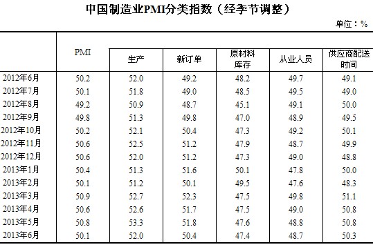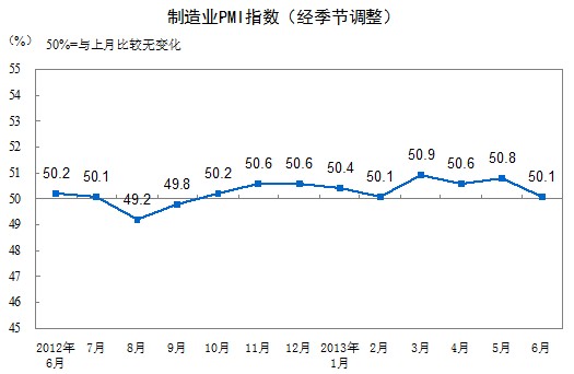 2013年6月,中國制造業(yè)采購經(jīng)理指數(shù)(PMI)為50.1%,比上月回落0.7個(gè)百分點(diǎn)。
