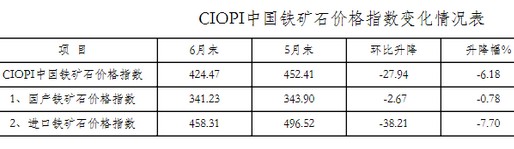 6月末,中國鐵礦石價格指數(shù)(CIOPI)為424.47點,環(huán)比下降27.94點,降幅為6.18%,較上月加大了1.07個百分點。其中:國產(chǎn)鐵礦石價格指數(shù)為341.23點,環(huán)比下降0.78%;進(jìn)口鐵礦石價格指數(shù)為458.31點,環(huán)比下降7.70%,進(jìn)口鐵礦石價格指數(shù)降幅大于國產(chǎn)鐵礦石。(見下表)