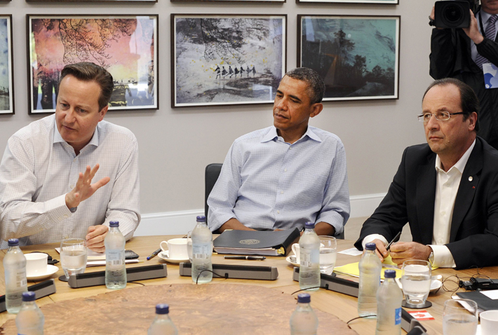 6月18日,在英國北愛爾蘭西部厄恩湖,英國首相卡梅倫(左)、美國總統(tǒng)奧巴馬(中)和法國總統(tǒng)奧朗德參加八國集團(tuán)峰會(huì)工作會(huì)議。新華社/法新 |