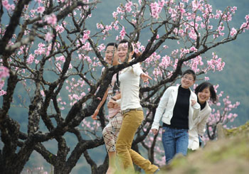 田壟上勞作的老漢跟好奇的游客攀談桃事,“夏天來我家吃桃子吧,正宗的水蜜桃,樹上養(yǎng)熟的!狈罨硕贾浪f的那種桃子:不同于為了方便運輸在它變軟之前提早采摘下來的,而是供桃樹的主人享用而任它在樹上長到自然的果熟蒂落的。那種桃子拿在手里是軟乎乎的,看著是半透明的,里邊的果肉都化成了一包蜜水,可以找一根麥秸,戳破表皮深入到果肉中像喝飲料一樣吸……這么想著,讓人真恨不得把時間馬上拔到七八月水蜜桃成熟的季節(jié),或者直接找根吸管對著桃花去吮吸花萼深處的花蜜。