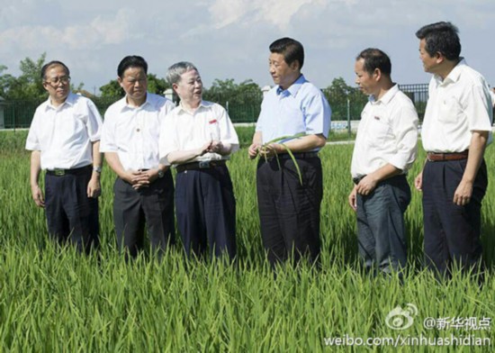 據(jù)新華社新華視點(diǎn)微博報(bào)道,22日下午,習(xí)近平來(lái)到鄂州市鄂城區(qū)杜山鎮(zhèn)東港村育種基地,拔起一棵稻苗察看分蘗情況,夸獎(jiǎng)“很壯實(shí)”。聽說(shuō)武漢大學(xué)朱英國(guó)院士負(fù)責(zé)培育的雜交稻良種累計(jì)推廣億畝以上,總書記說(shuō),您辛苦了,感謝你們作的貢獻(xiàn),希望繼續(xù)努力。糧食安全要靠自己。