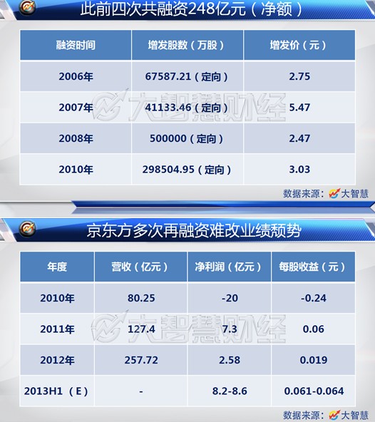 翻閱京東方A近3年財(cái)報(bào)數(shù)據(jù)發(fā)現(xiàn),2010年公司營(yíng)收80.25億,凈利潤(rùn)卻是負(fù)20億;2011年?duì)I收127.4億,凈利潤(rùn)7.3億元;2012年?duì)I收257.72億元,凈利潤(rùn)2.58億元。每次當(dāng)公司岌岌可危、頻臨退市邊緣,就會(huì)拋出定增、重組等方案。06到08年間京東方連續(xù)三年定增,從股市中不斷抽血。但在每次融資之后,公司經(jīng)營(yíng)狀況卻不見好轉(zhuǎn)。為何巨額投資只帶來這點(diǎn)利潤(rùn)?