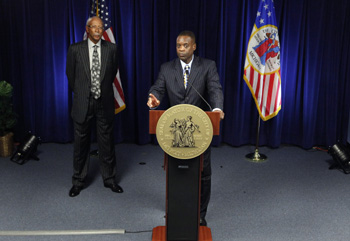 7月18日,美國底特律緊急財政管理人凱文·奧爾(右)在底特律出席新聞發(fā)布會。奧爾當天獲密歇根州州長里克·斯奈德授權(quán),向位于底特律的美國破產(chǎn)法院遞交破產(chǎn)申請。 新華社/美聯(lián) |