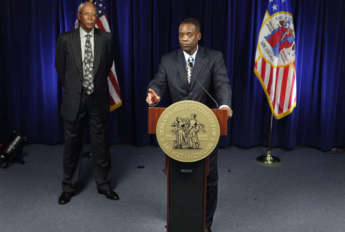 7月18日,美國底特律緊急財(cái)政管理人凱文·奧爾(右)在底特律出席新聞發(fā)布會(huì)。奧爾當(dāng)天獲密歇根州州長里克·斯奈德授權(quán),向位于底特律的美國破產(chǎn)法院遞交破產(chǎn)申請(qǐng)。新華社/美聯(lián)