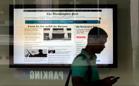 美國《華盛頓郵報》公司5日宣布,網(wǎng)絡(luò)購物公司亞馬遜創(chuàng)始人杰夫·貝索斯將以2.5億美元現(xiàn)金收購久負盛名但近年陷入經(jīng)營困境的《華盛頓郵報》。最早創(chuàng)建于1877年的《華盛頓郵報》是美國最負盛名的報紙之一,曾揭露“水門事件”、“五角大樓越戰(zhàn)文件”等轟動全球的丑聞,“棱鏡門”事件也由該報與英國《衛(wèi)報》最先披露! 圖為8月5日,一男子離開美國《華盛頓郵報》辦公大樓。
