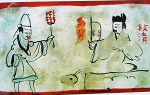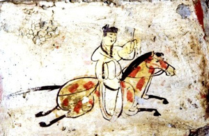 一是《驛使圖》——全國(guó)郵政的標(biāo)志,出自5號(hào)墓。畫(huà)面是一個(gè)驛使騎在紅鬃馬上,頭戴進(jìn)賢冠,身穿寬袖衣,足蹬長(zhǎng)靴,左手舉木牘文書(shū),右手持馬韁,驛騎四蹄騰空,信使則穩(wěn)坐馬背飛奔傳遞。這幅驛使圖再現(xiàn)了當(dāng)時(shí)西北邊疆驛使馳送文書(shū)的情景,被認(rèn)為是我國(guó)發(fā)現(xiàn)最早的古代郵驛的形象資料。