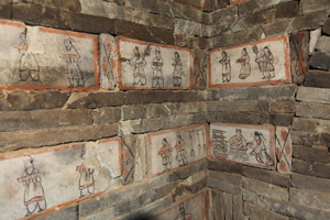 嘉峪關(guān)長(zhǎng)城研究所張曉東說(shuō),墓室以干磚壘砌而成,墓室四壁為表現(xiàn)勞動(dòng)人民各種生產(chǎn)生活、奴婢仆從的雜役和墓主人享樂(lè)生活的磚畫(huà),如宴樂(lè)、狩獵、馴鹿、采桑、驛傳、舞蹈、農(nóng)耕、博弈、釀酒、屠宰、出巡等。