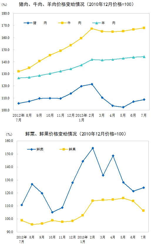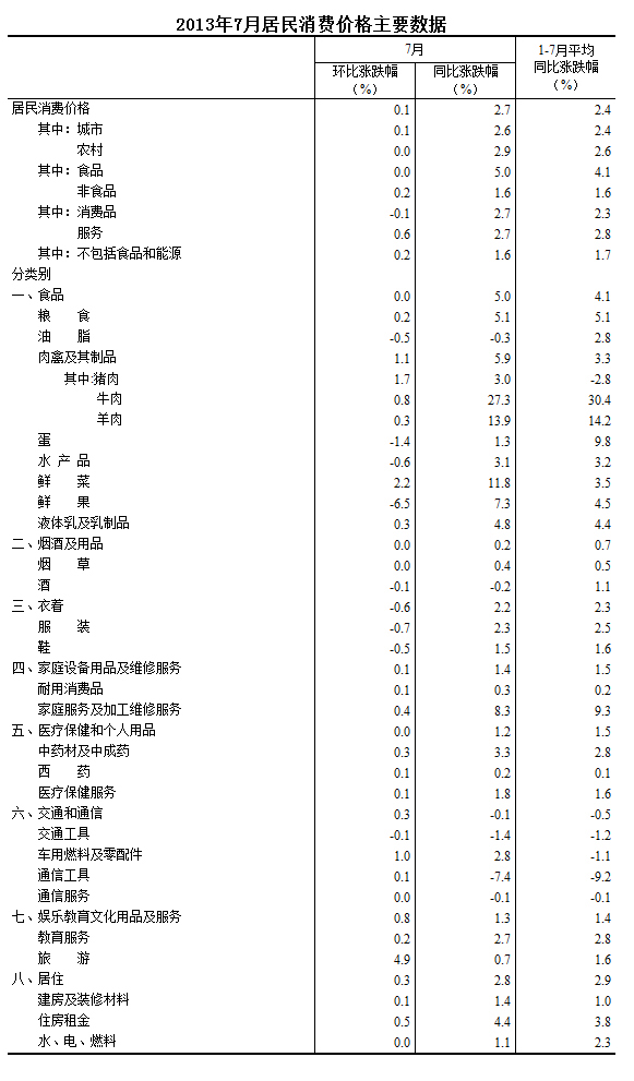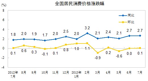 2013年7月份,全國居民消費價格總水平同比上漲2.7%。其中,城市上漲2.6%,農(nóng)村上漲2.9%;食品價格上漲5.0%,非食品價格上漲1.6%;消費品價格上漲2.7%,服務(wù)價格上漲2.7%。1-7月平均,全國居民消費價格總水平比去年同期上漲2.4%。