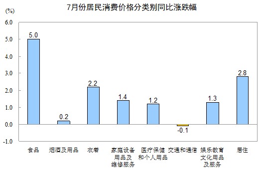 7月份,食品價格同比上漲5.0%,影響居民消費價格總水平同比上漲約1.61個百分點。其中,肉禽及其制品價格上漲5.9%,影響居民消費價格總水平上漲約0.42個百分點(豬肉價格上漲3.0%,影響居民消費價格總水平上漲約0.09個百分點);鮮菜價格上漲11.8%,影響居民消費價格總水平上漲約0.32個百分點;糧食價格上漲5.1%,影響居民消費價格總水平上漲約0.15個百分點;鮮果價格上漲7.3%,影響居民消費價格總水平上漲約0.14個百分點;水產(chǎn)品價格上漲3.1%,影響居民消費價格總水平上漲約0.08個百分點。